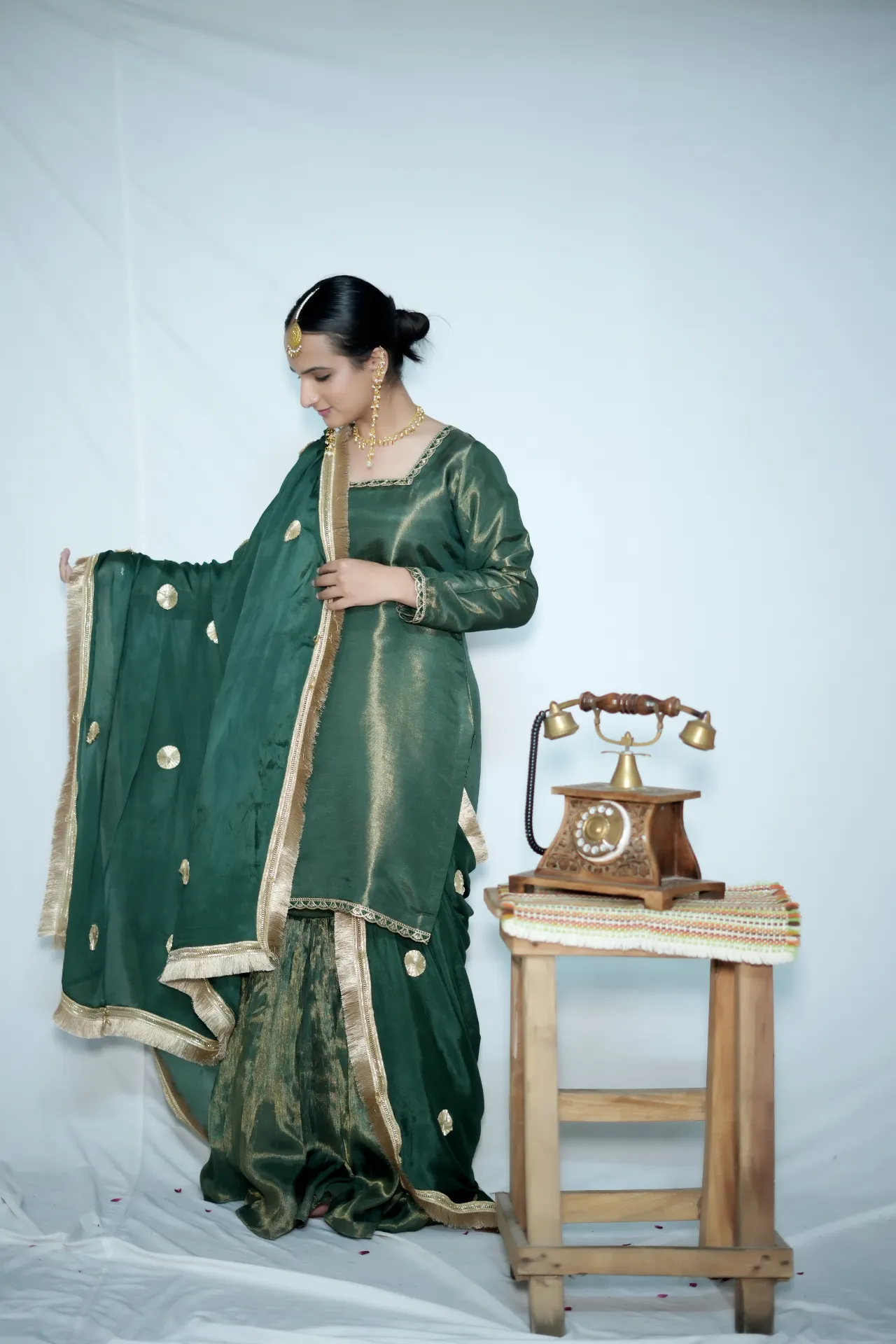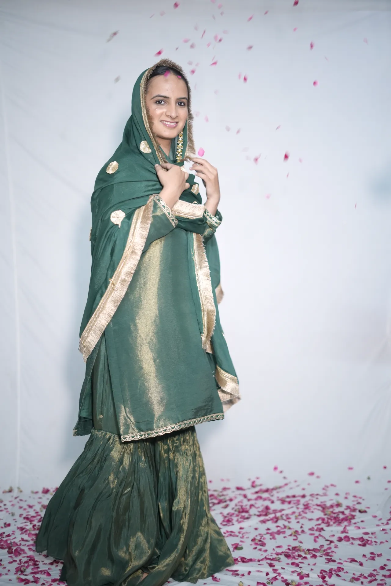 Bottle Green floor length garara perfect for night and morning events in 100% Pure Organza with gotta work on shirt and arms. The dupatta is made of pure chiffon with gotta heritage work and jhalar lace reflects the perfect vision of the heritage and royalty. The full suit is with cotton lining for breathability. This suit is the fusion of Punjabi and Mughal tradition and can be color customized. You can always reach out to us via WhatsApp for more details and customization.