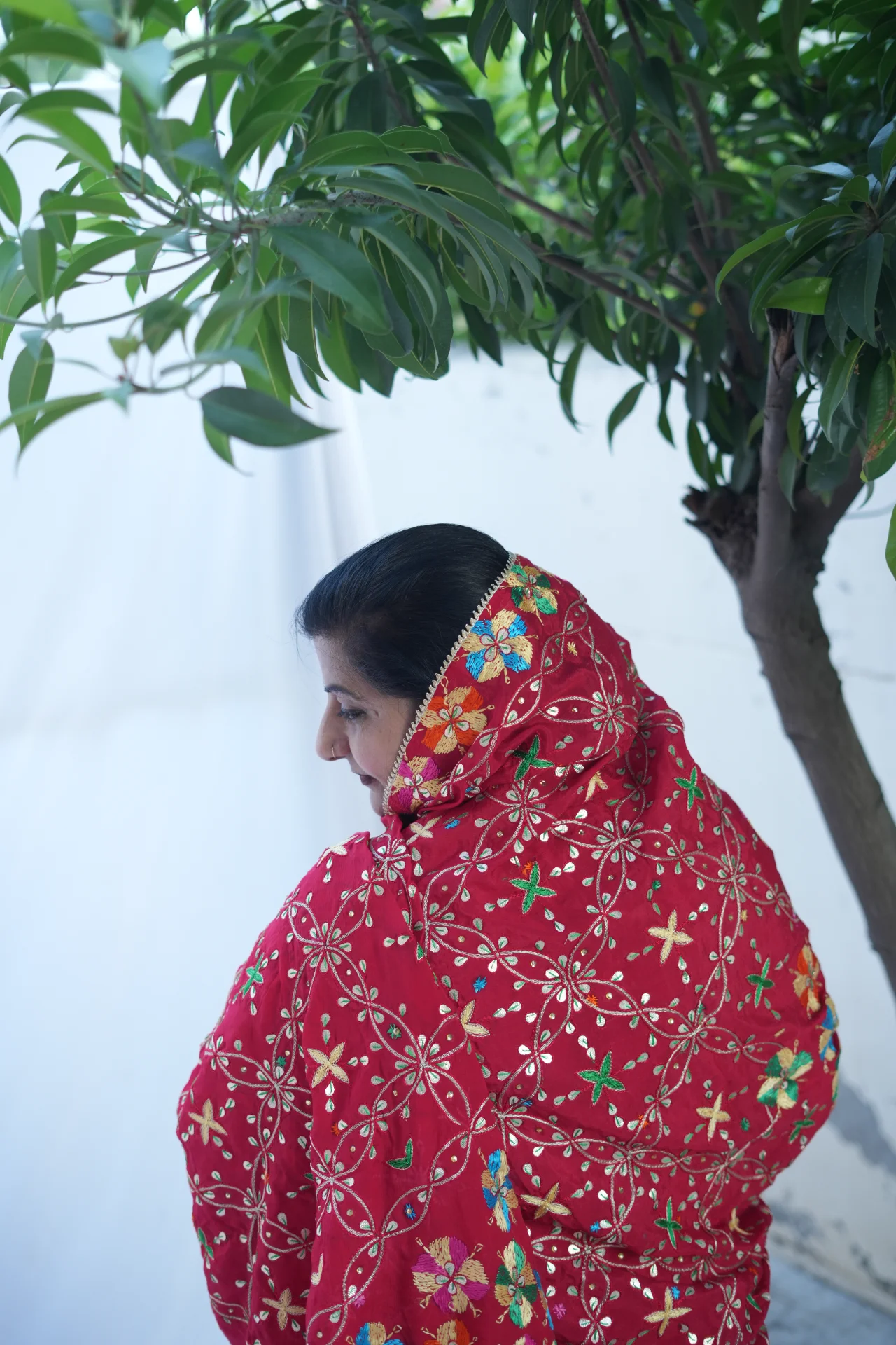 With its soft drape and natural sheen, this phulkari is a celebration of both elegance and legacy. Taking 7–9 weeks to complete, each dupatta is carefully handcrafted to preserve the charm of phulkari while embracing the symbolism of the pippal-pattiya leaf motif.