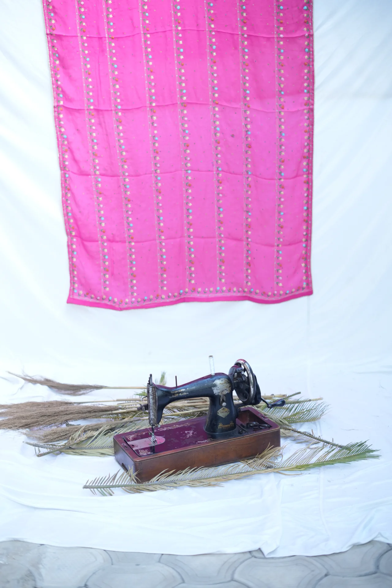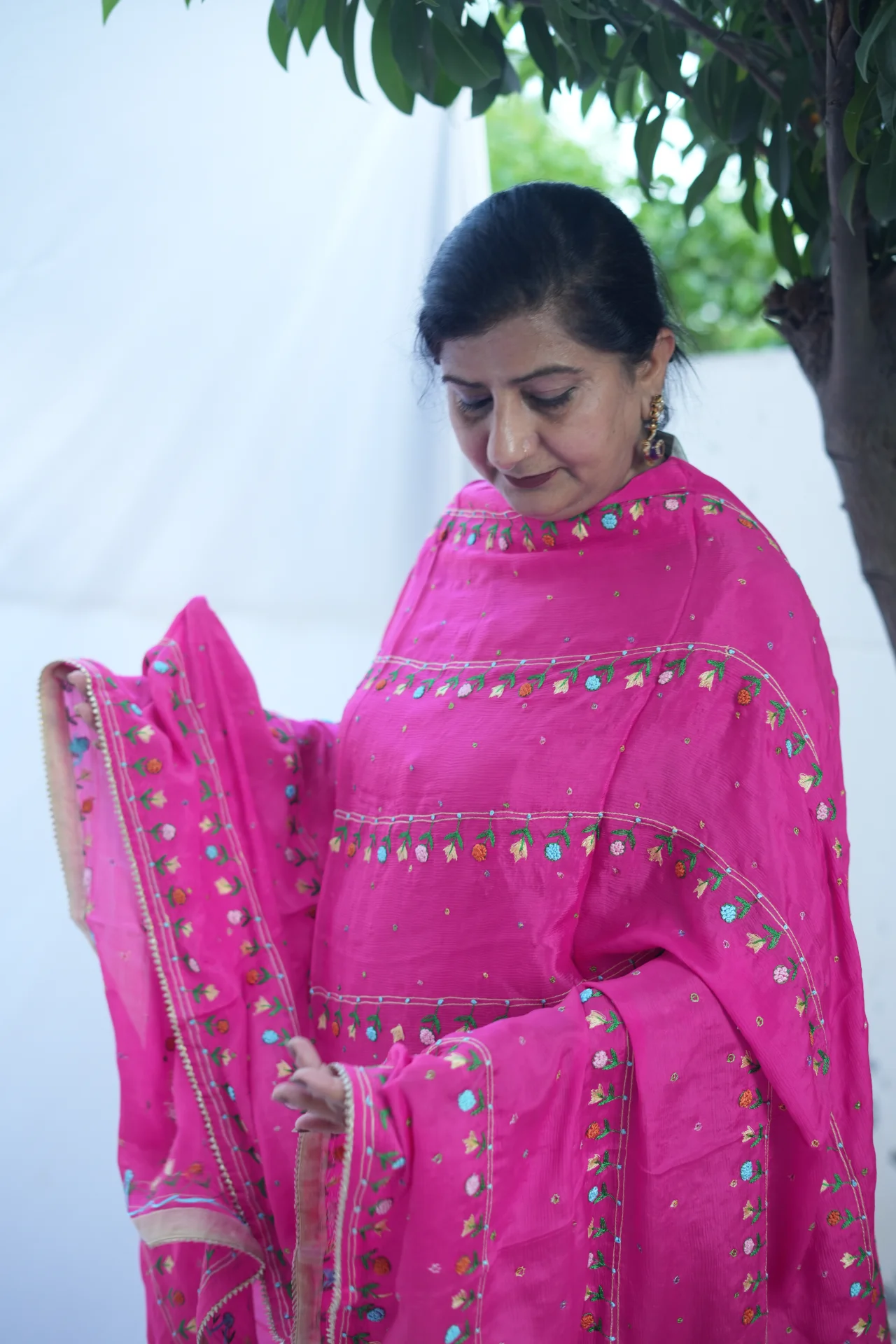 The Sindoori Booti-Gul Phulkari is a celebration of subtlety and heritage, designed for Ranis who embrace minimalism with grace. Crafted on pure Chinon, the fabric feels like butter against the skin, flowing effortlessly with every movement. The sindoori booti patterns fuse seamlessly with traditional phulkari work, offering a refined royal charm for women who prefer understated elegance.