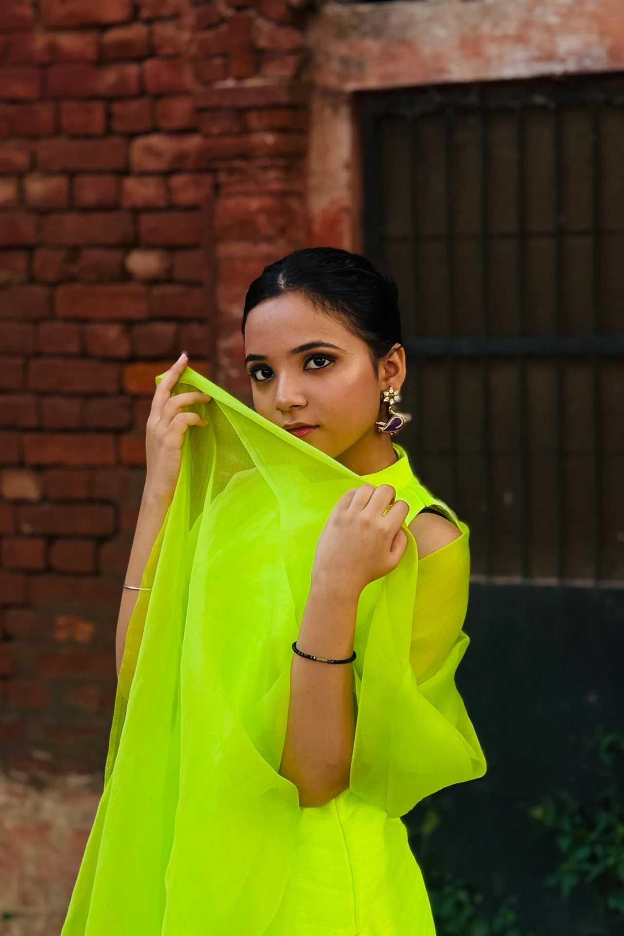 Royal Neon formal pret with short shirt and farshi shalwar on pure khadi cotton fabric with full mulmul lining and pure organza dupatta with border is best for family functions or classy events. This can be worn with minimal earrings and high bun to show off your confidence in the most trendy colour with the minimal and royal look of heritage farshi shalwar. The halter neck and back cut with give you a tall look. This can be worn with juttis and heels.