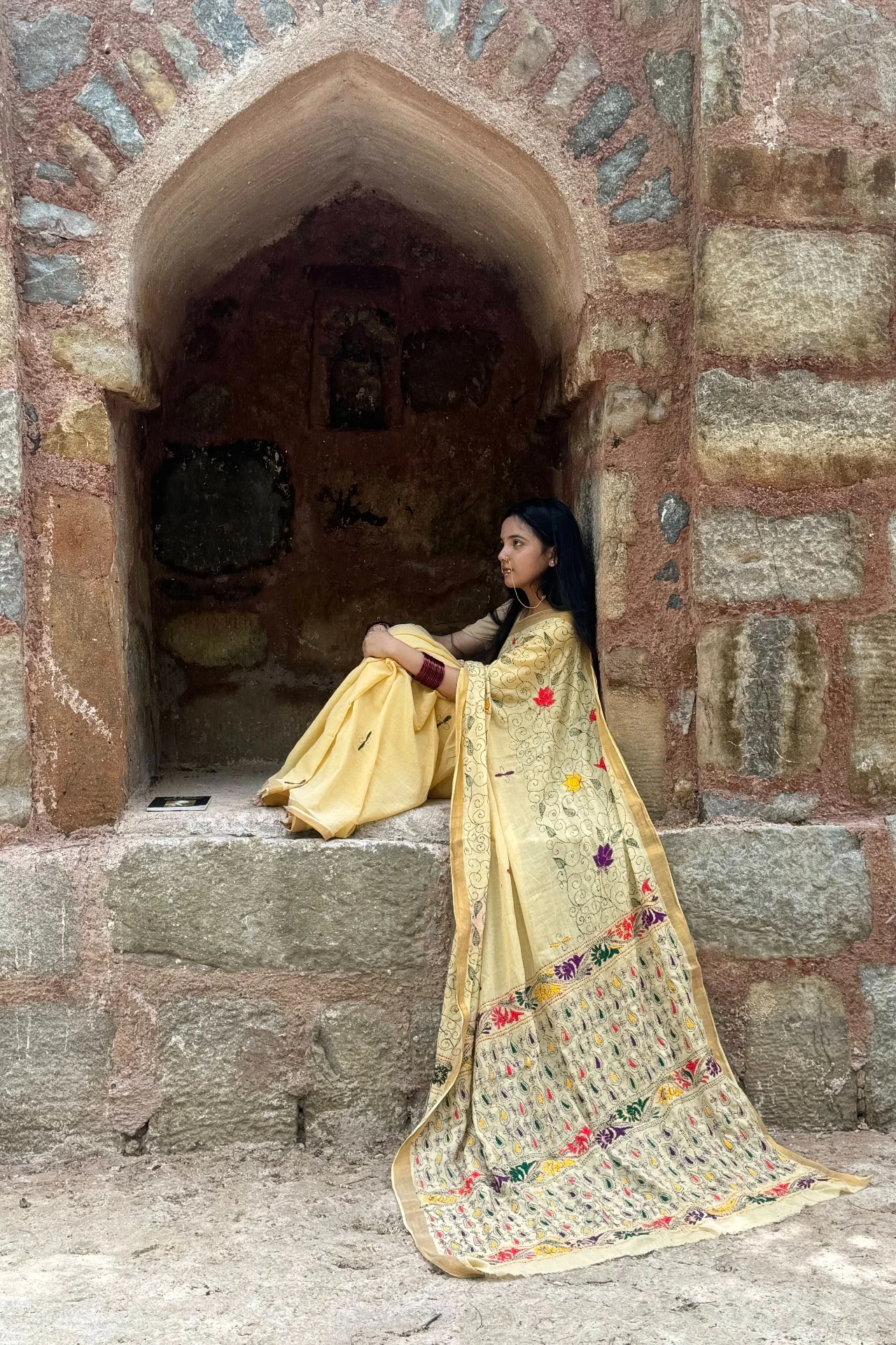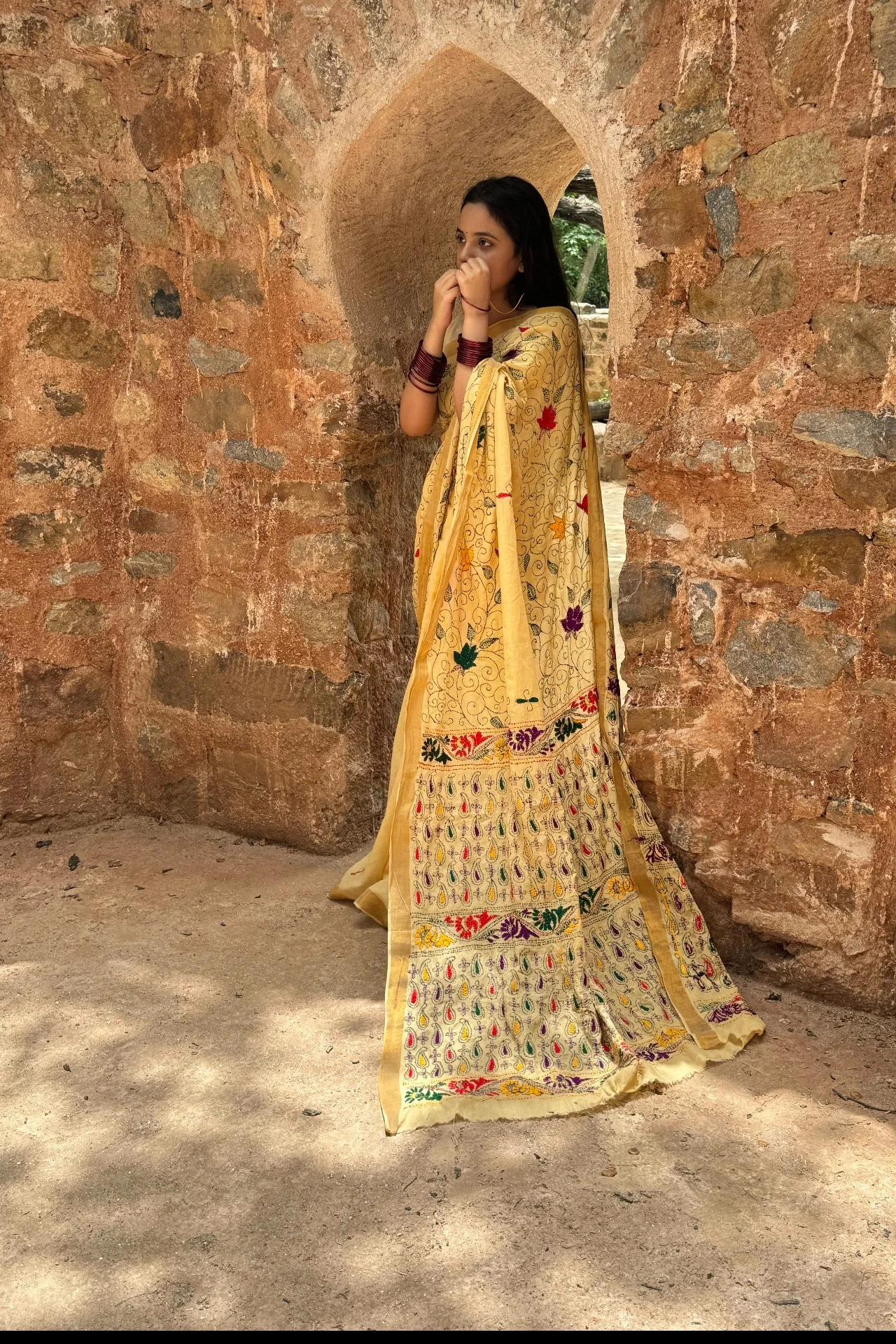 Cultural Fusion – Combines Bengali kantha stitching with Punjabi phulkari embroidery.