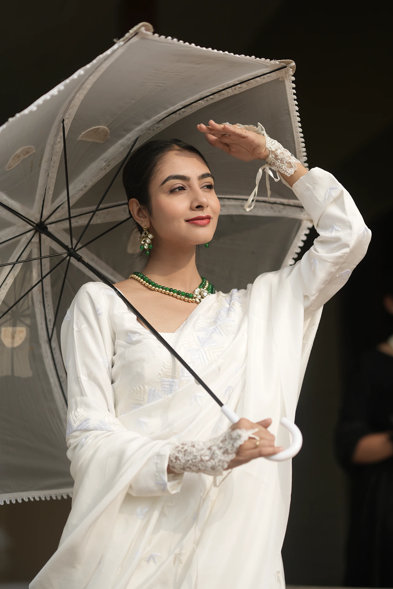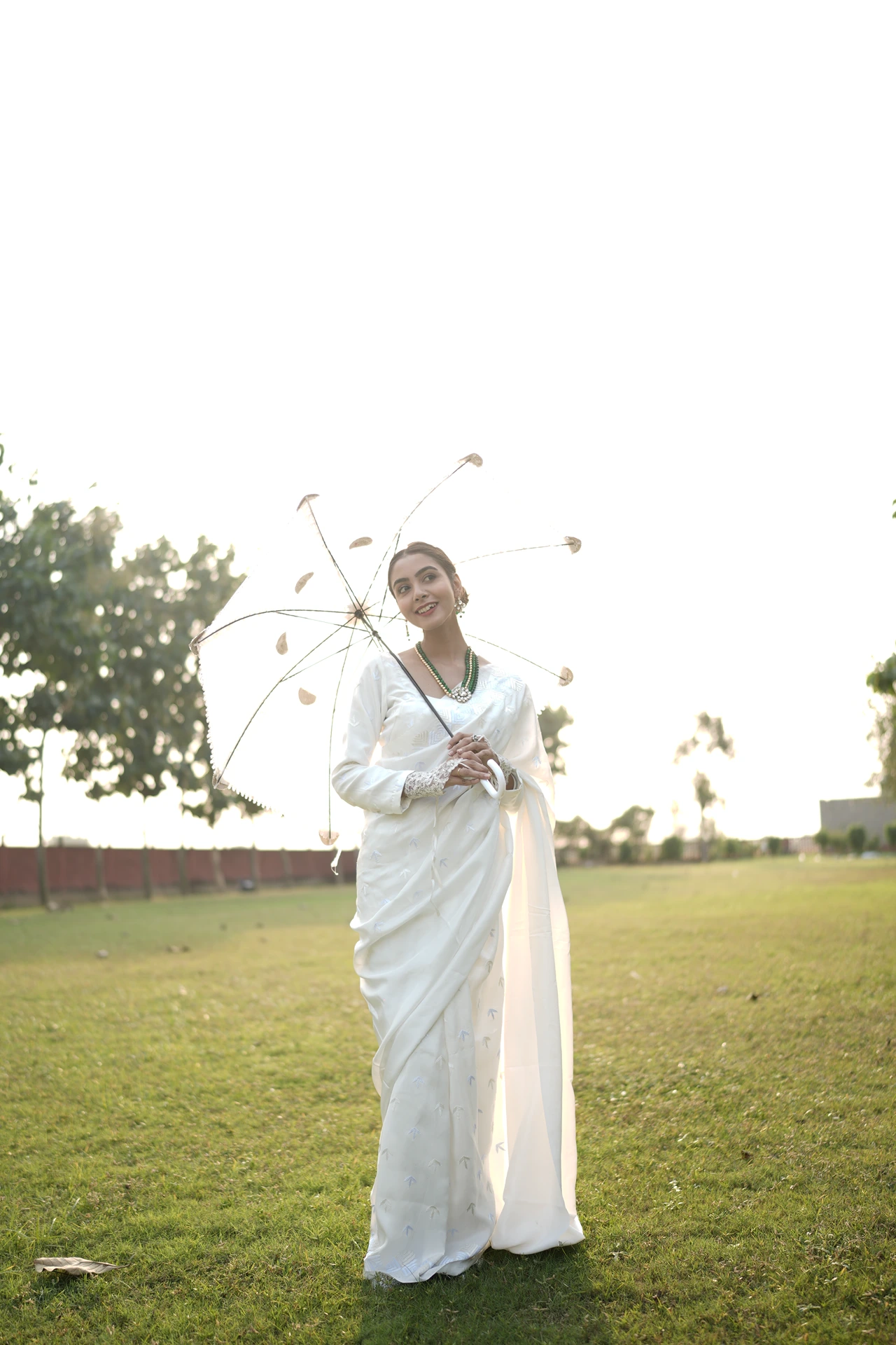 This saree isn’t about making a statement — it’s about owning the silence that follows. The Pure Royalty in White is a masterpiece for those who rule through grace, not grandeur.