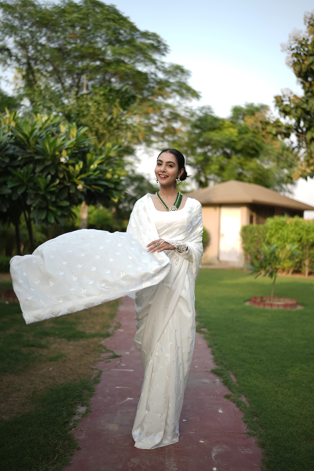 The Pure Royalty in White Saree embodies the essence of timeless sophistication. Handcrafted from pure 80g raw silk, this saree celebrates purity, calm, and confidence — qualities of a true Rani.
