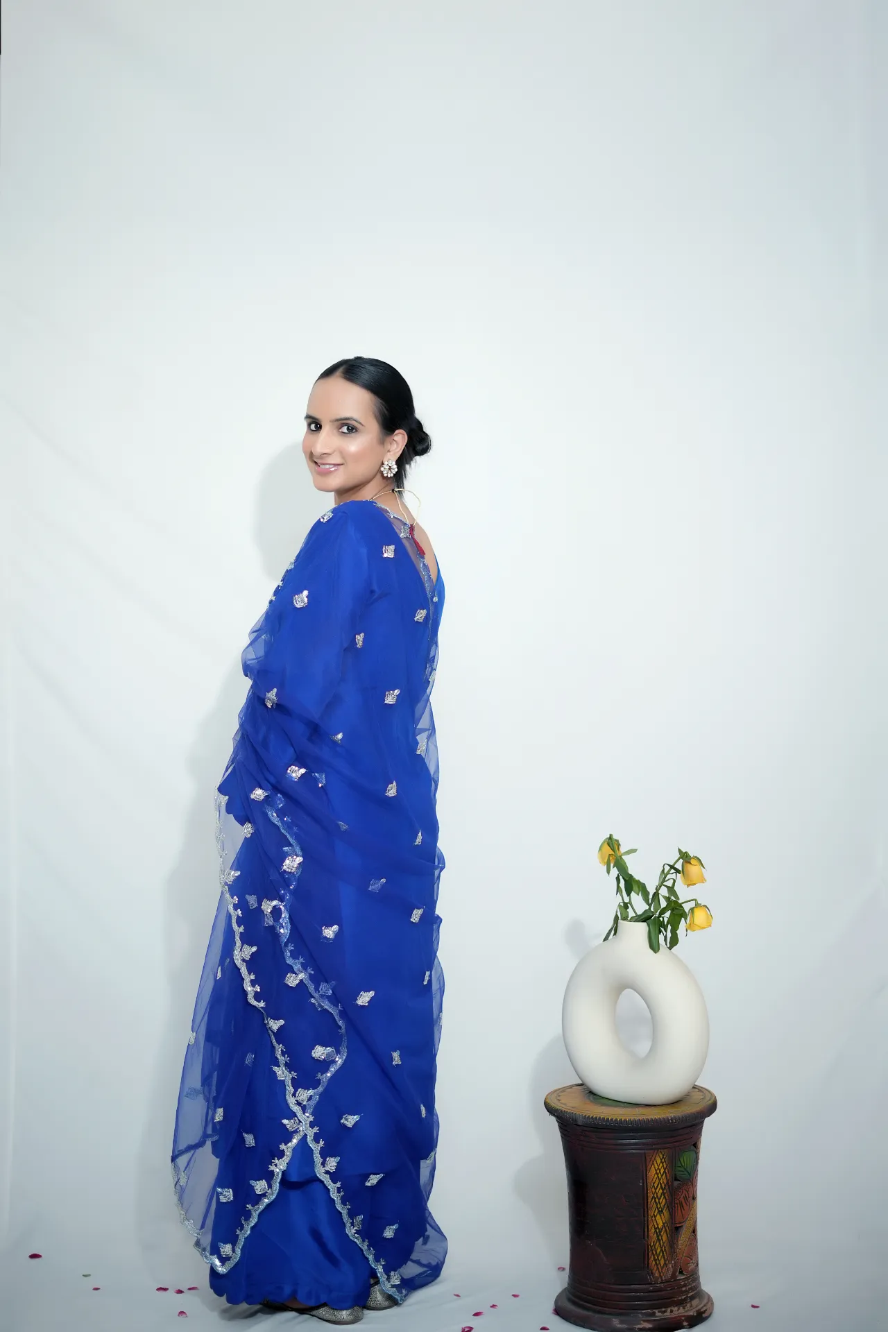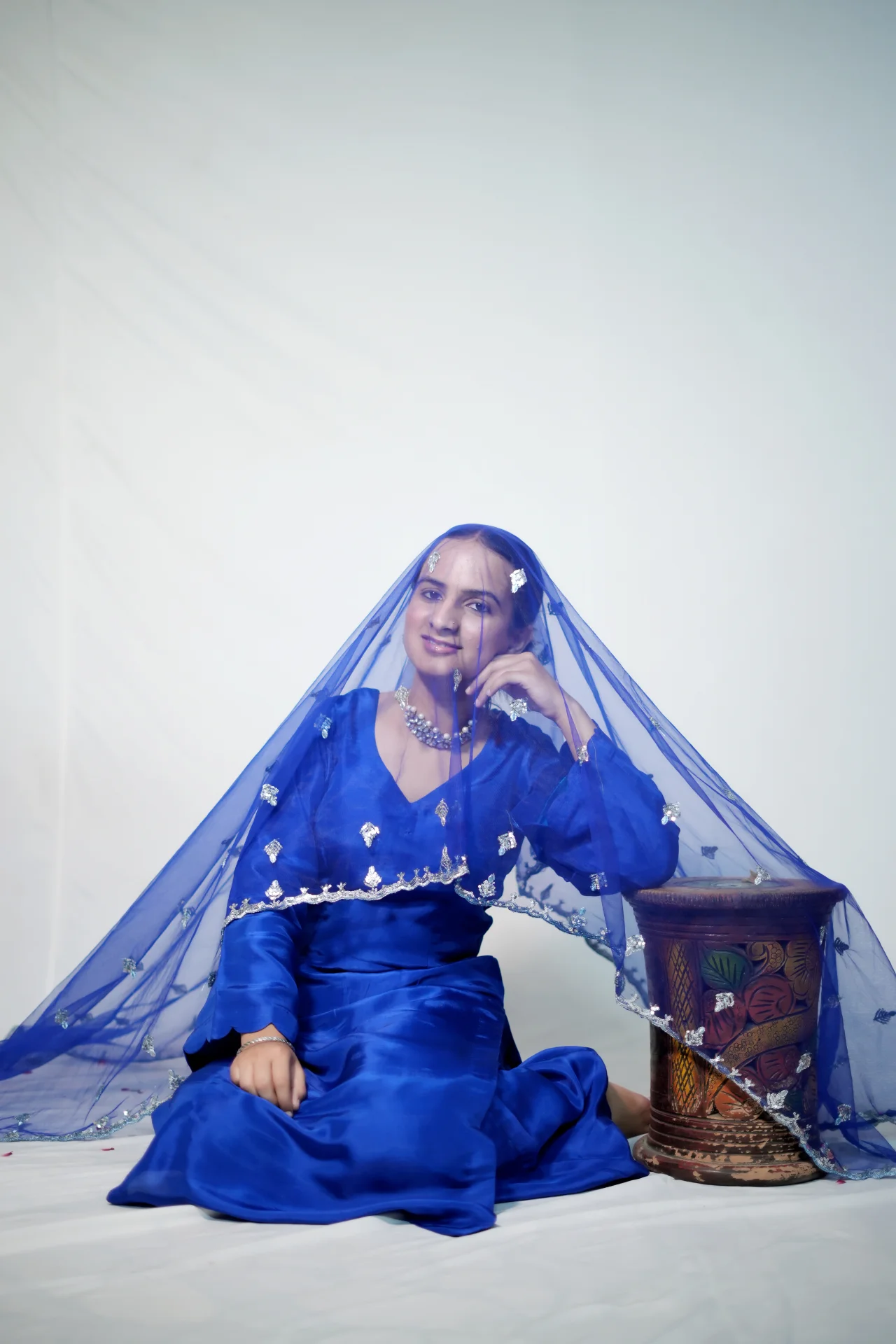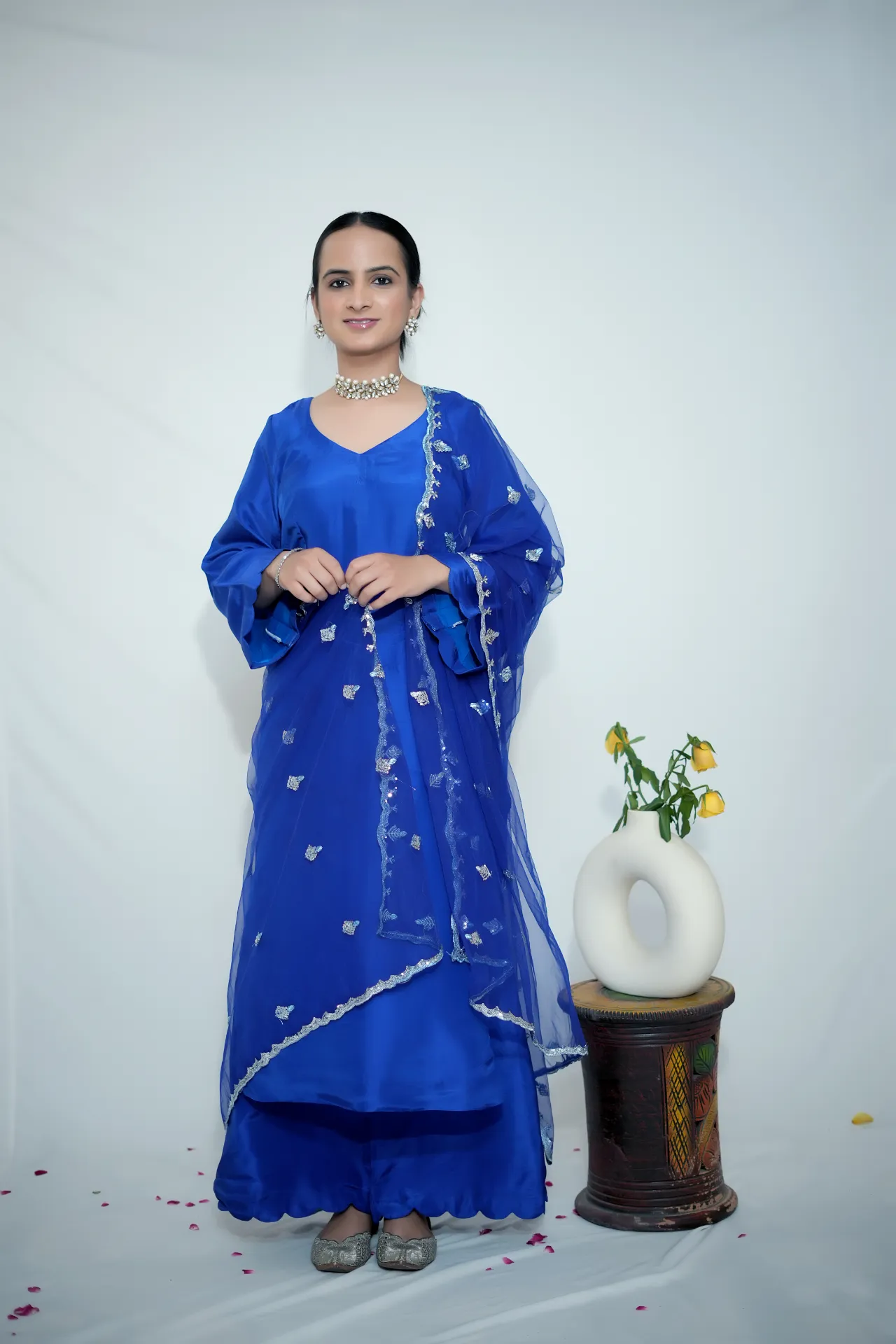 Royal Blue color formal pret of long shirt and ankle length wide leg cutwork trouser on pure silk fabric with full cotton lining and pure organza dupatta with silver work is best for official events, family functions. This can be worn with sleek silver or pearl jewellery to have a proper royal, elegant look.